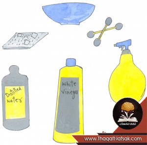 – في هذه الخطوة ، يمكنك عمل محلول التنظيف عن طريق خلط معلقة كبيرة من الخل الأبيض مع أربعة ملاعق ماء .